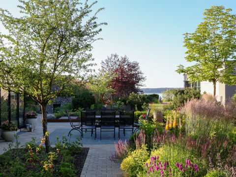 The presence of nature and the charm of a wild landscape are introduced into the garden through an orchard and small wildflower meadows. These features add naturalistic elements, reduce maintenance requirements, and seamlessly blend the decorative garden with the lake’s natural shoreline.